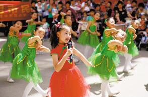图为小学生志愿者用自编自导自演的文艺节目批评不文明现象,弘扬正能量,倡导大家为省会创建文明城贡献力量。